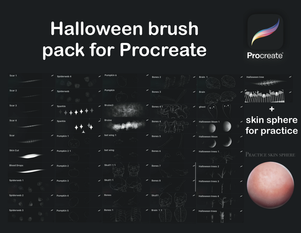 50+ brushes for PROCREATE and a .psd file with a skin sphere to practice